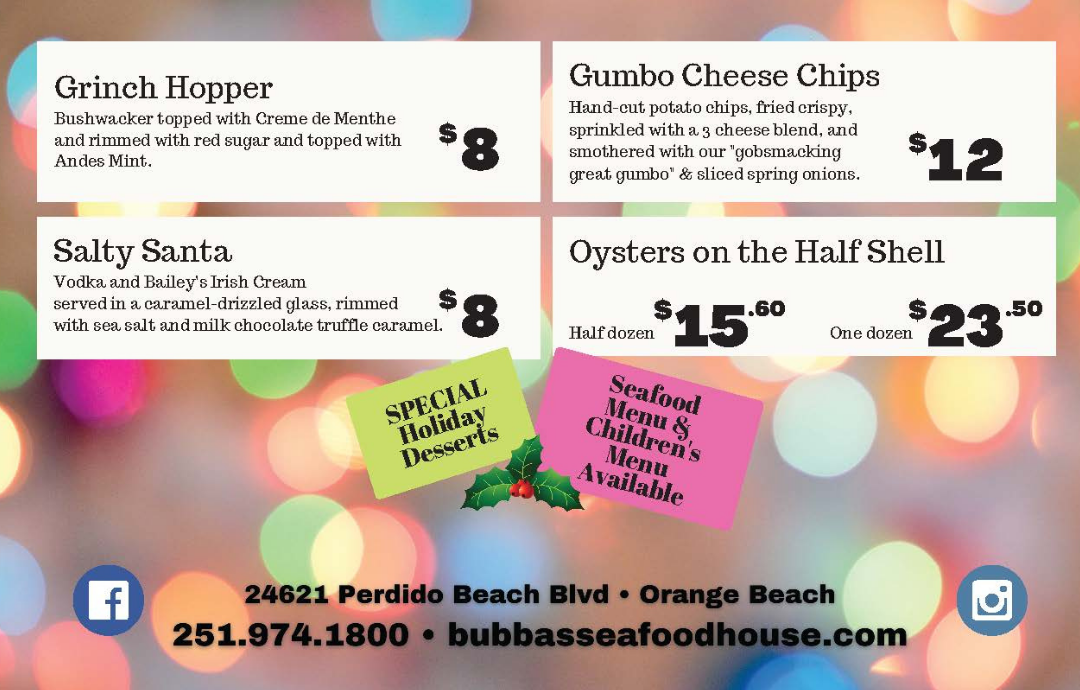 Bubba’s delicious shrimp po’boys, fresh fish, and juicy steamed crab legs are absolute favorites around here. Most of the locals and visitors order our large “build-your-own” seafood platter. Mmmmmm, so good!